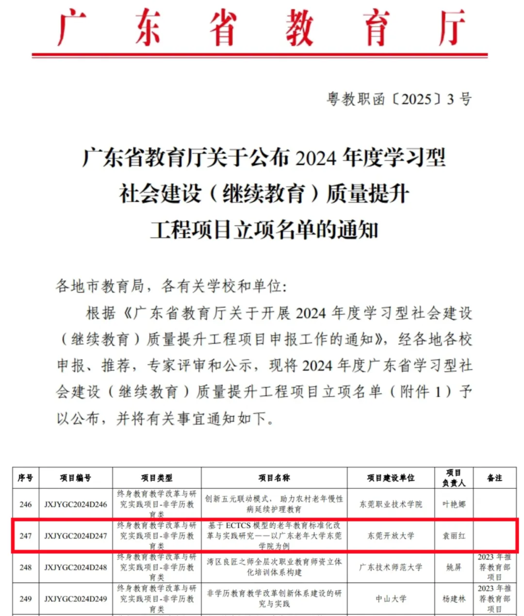 此外,我校申报的2024 年度广东省学习型社会建设(继续教育)质量提升工程项目:《基于ECTCS模型的老年教育标准化改革与实践研究—以广东老年大学东莞学院为例》项目也于2025年3月成功立项。
