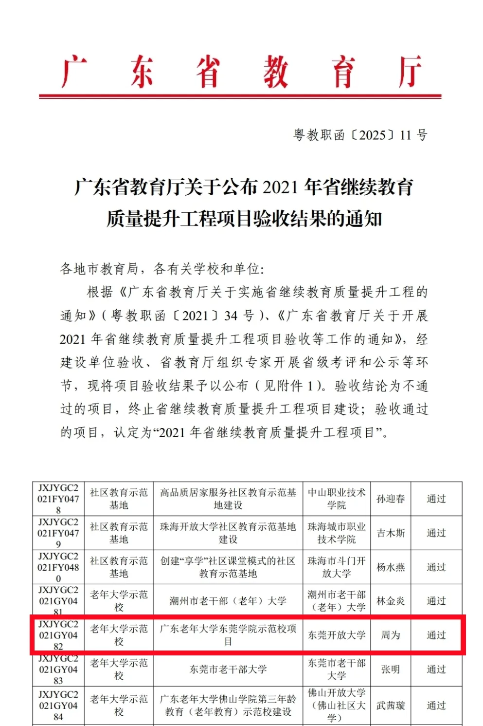 日前,广东省教育厅发布《广东省教育厅关于公布 2021 年省继续教育质量提升工程项目验收结果的通知》(粤教职函〔2025〕11 号),我校老年大学示范校项目在历经东莞市教育局初验、省教育厅组织专家省级考评、现场验收及公示等严格环节后,顺利通过 “2021 年省继续教育质量提升工程项目”验收,标志着学校在老年教育领域的创新实践获得省级权威认可。