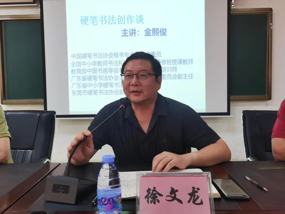 东莞市硬笔书法协会副主席、东莞开放大学书法社社长金熙俊作《硬笔书法创作谈》讲座,从书法文化、选材择题、规划布局、执笔运笔等方面就如何创作一幅硬笔书法作品进行讲解、示范。