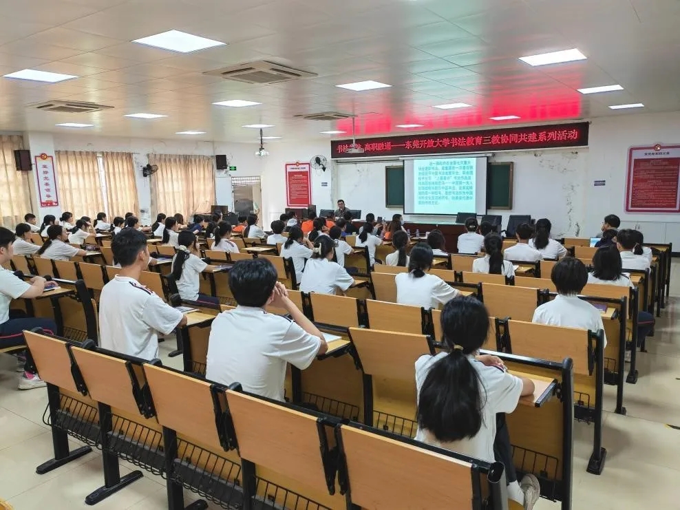 党的二十大报告提出“统筹职业教育、高等教育、继续教育协同创新”,东莞开放大学积极响应号召、践行三教融合发展,组织书法学生社团开展“书法课堂进中职”三教协同共建系统活动。2024年6月25日上午,活动第一站走进广东开放大学附属职业技术学校东莞分校,在中职学生中传播书法艺术、弘扬传统文化。东莞开放大学校务委员徐文龙、附属中职东莞分校校长冉令洲、美术教育中心主任喻涌波、东莞市硬笔书法协会副主席金熙俊出席本次活动,书法社团20多名骨干成员以及50多名中职学生参加活动。