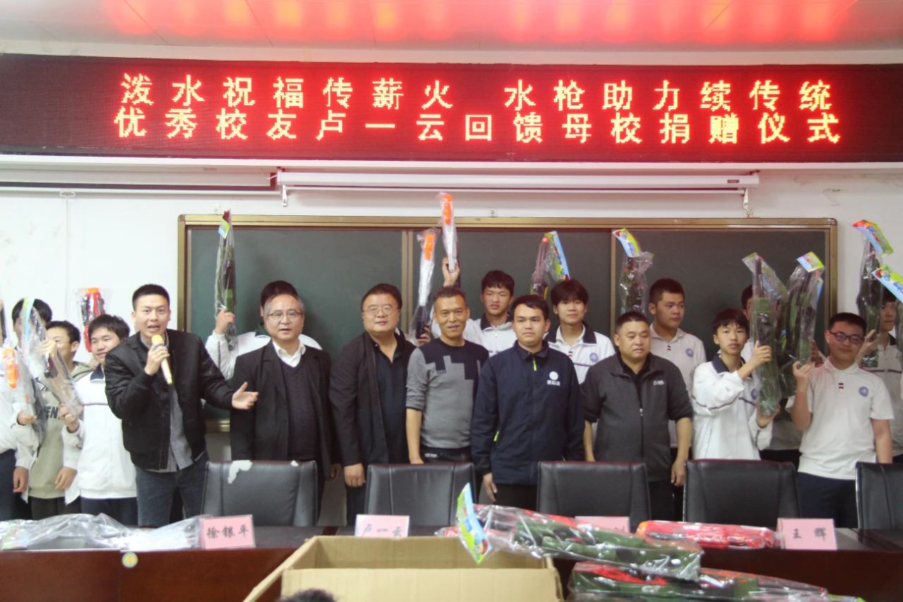 捐赠仪式上,校领导和校友以水枪泼水造型合影,象征团结与希望,共同记录美好时刻。