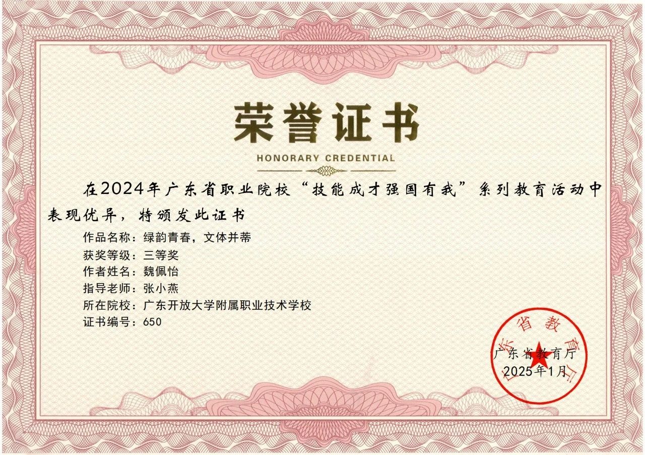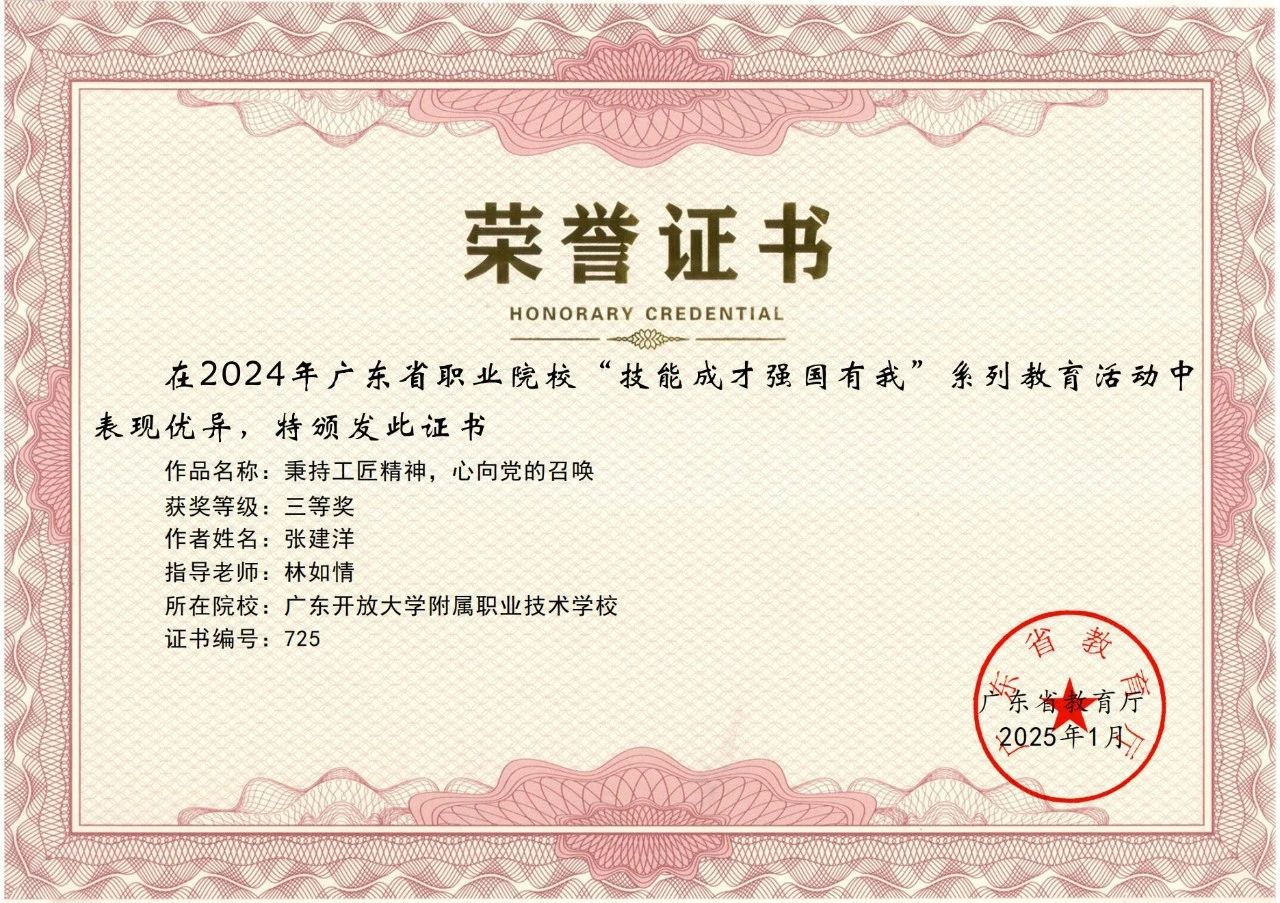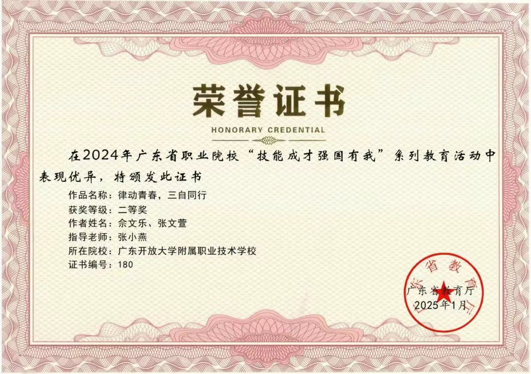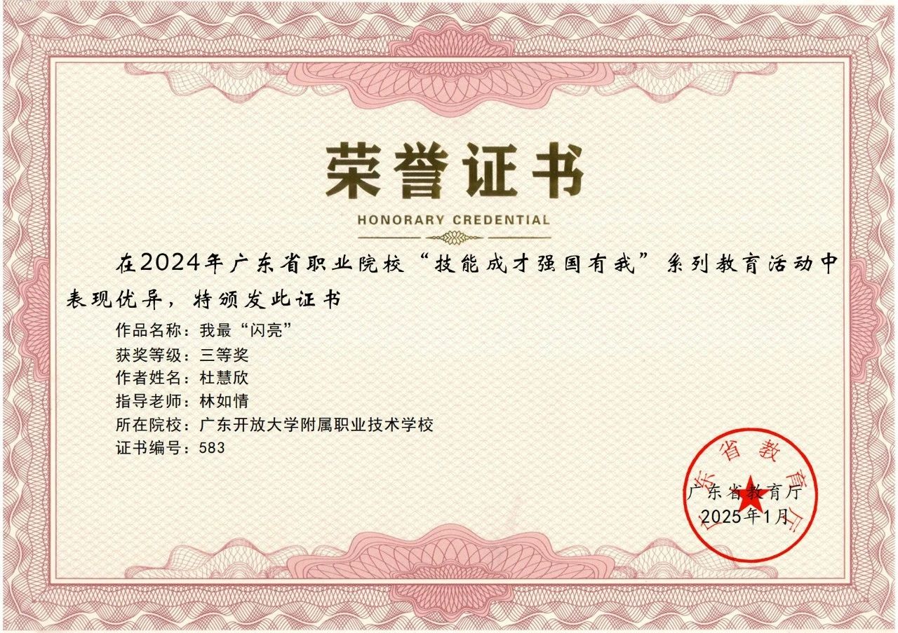 热烈祝贺我校在2024 年广东省职业院校 “技能成才 强国有我” 系列教育活动中荣获多项荣誉!根据《广东省教育厅关于公布 2024 年职业院校 “技能成才 强国有我” 系列教育活动结果的通知》(粤教思函〔2025〕9 号),我校师生在多个项目中表现优异,共斩获二等奖 3 项、三等奖 9 项,充分展现了开大附职学子的专业素养与青春风采。