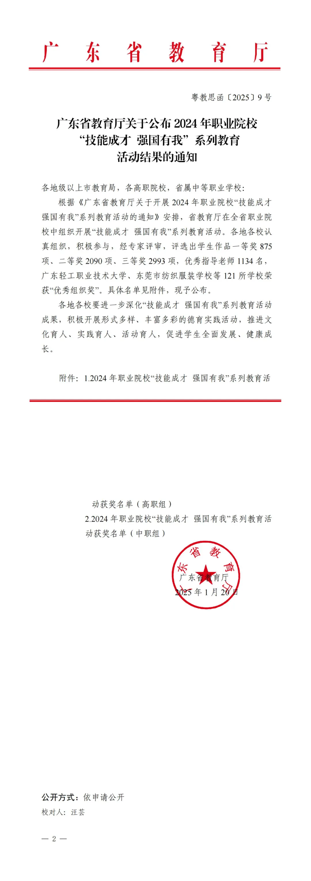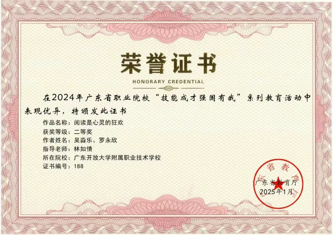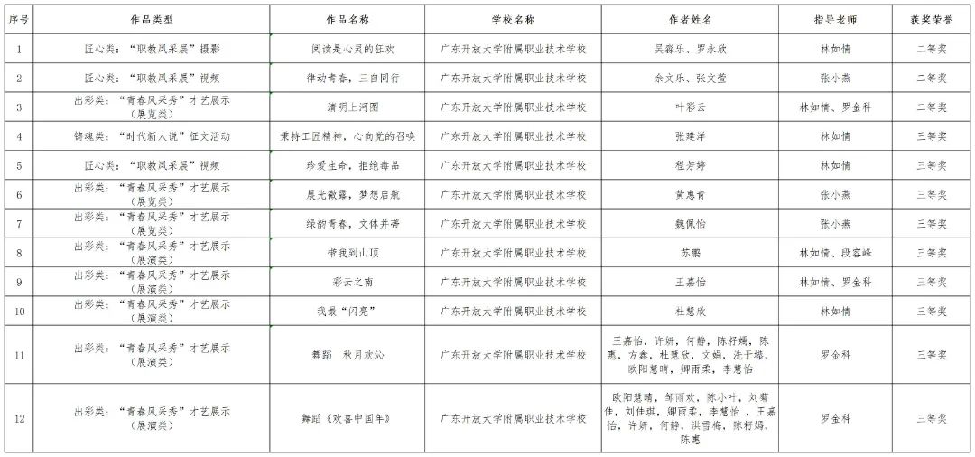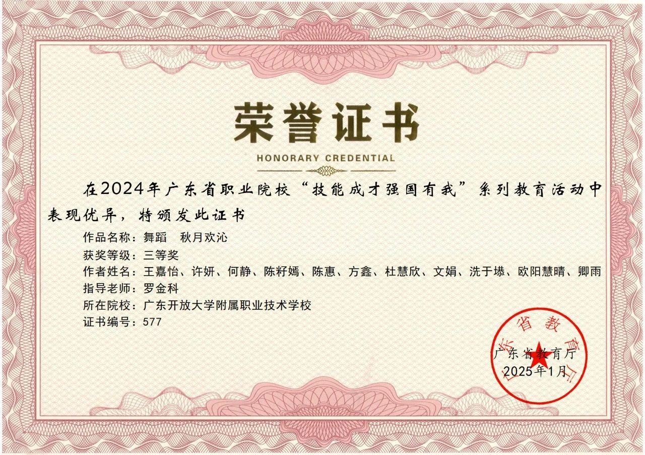 热烈祝贺我校在2024 年广东省职业院校 “技能成才 强国有我” 系列教育活动中荣获多项荣誉!根据《广东省教育厅关于公布 2024 年职业院校 “技能成才 强国有我” 系列教育活动结果的通知》(粤教思函〔2025〕9 号),我校师生在多个项目中表现优异,共斩获二等奖 3 项、三等奖 9 项,充分展现了开大附职学子的专业素养与青春风采。