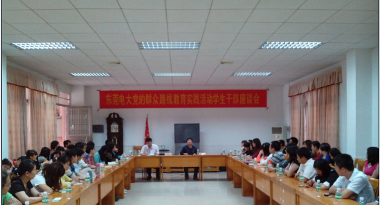 东莞电大教学处4月12日下午在学校会议室召开学生干部座谈会,针对我校目前开展群众路线教育活动征集学生干部意见。学生干部建议学校在新生入学时安排军训或拓展训练;学校给学生干部提供一些入党的机会;学校多组织些学生参加校园文化活动;落实严格的考勤制度来提高出勤率。学校组织班干部的培训活动;班主任多与学生交流,了解学生需求。