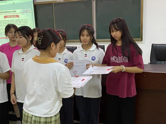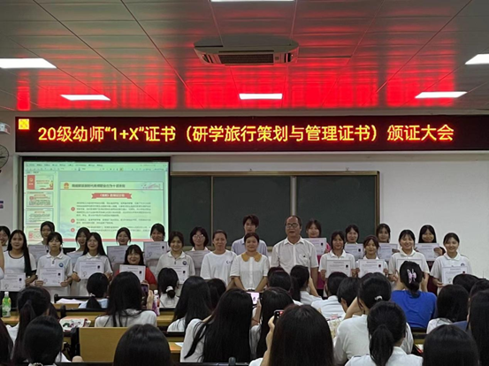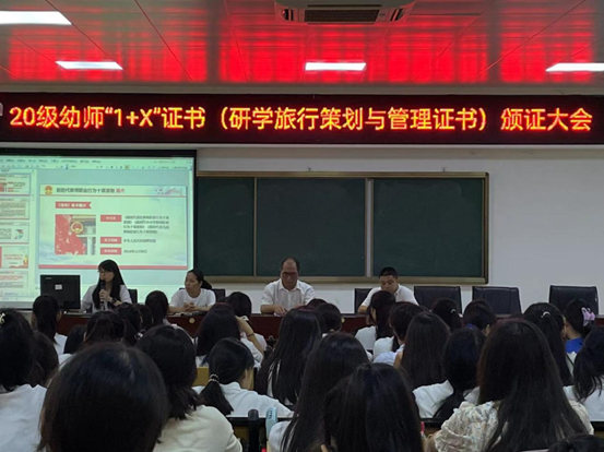 仪式上,周秀梅老师为20级幼师专业获得首期1+X研学旅行策划与管理等级证书的同学颁发证书。