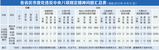 汇总表显示,在违反中央八项规定精神问题的19896人中,因违反公务用车管理使用有关规定被查5087人,约占总被查人数的25.57%;1068人因大操大办婚丧喜庆问题被查;965人因公款大吃大喝问题被查。此外,另有1万余人因包括公款旅游、公款出国境旅游、楼堂馆所违规、收送节礼、接受或用公款参与高消费娱乐或健身活动、庸懒散等方面的问题被查。