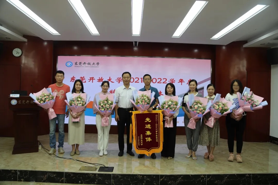 李树祥副校长宣读了《关于表彰2021-2022学年度东莞开放大学教科研先进集体的决定》。随后,校领导为获得教科研先进集体的学生工作处全体教职工颁发锦旗。