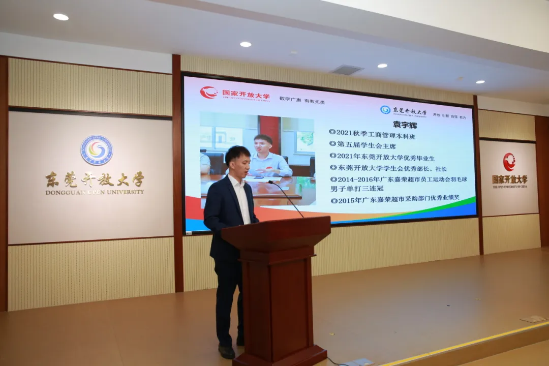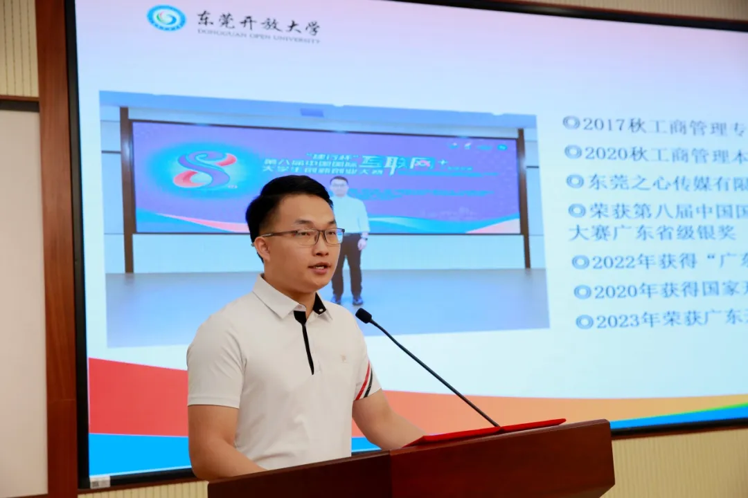 在第八届中国国际互联网+大学生创新创业大赛中获得省级银奖、国家开放大学优秀毕业生、东莞之心传媒有限公司总经理钟宏华同学在会上和大家分享了他学习心得以及创业经验。
