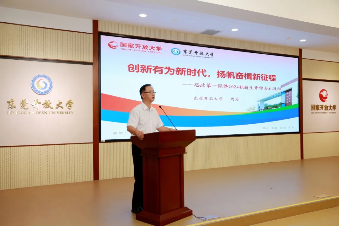 开学典礼上,学校党总支副书记周为以《创新有为新时代,扬帆奋楫新征程》为主题,为新生带来内涵丰富的“思政第一课”。周为副书记从立德树人、勇于创新、追求梦想、拓展认知等方面展开,以开放大学的校训精神和取得的成绩勉励新生,他强调,广大青年要肩负历史使命,坚定前进信心,立大志、明大德、成大才、担大任,努力成为堪当民族复兴重任的时代新人。