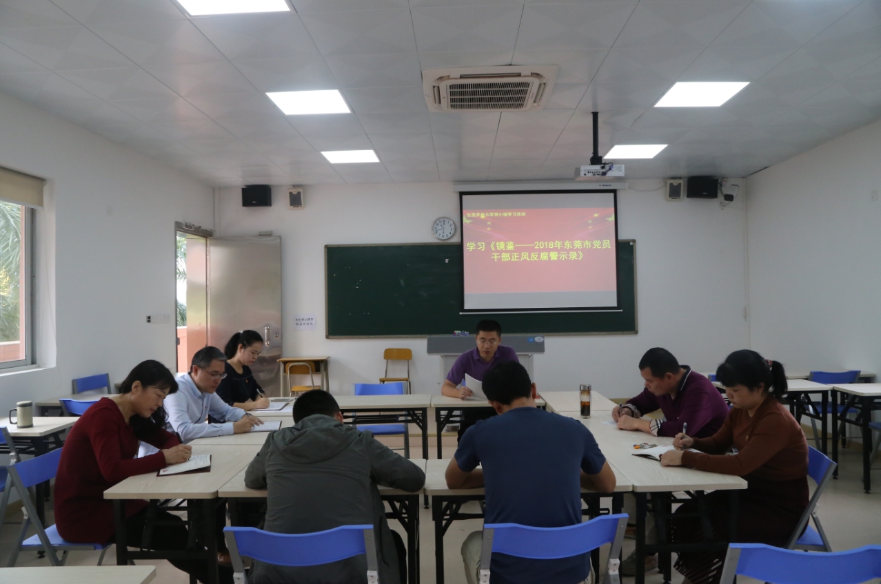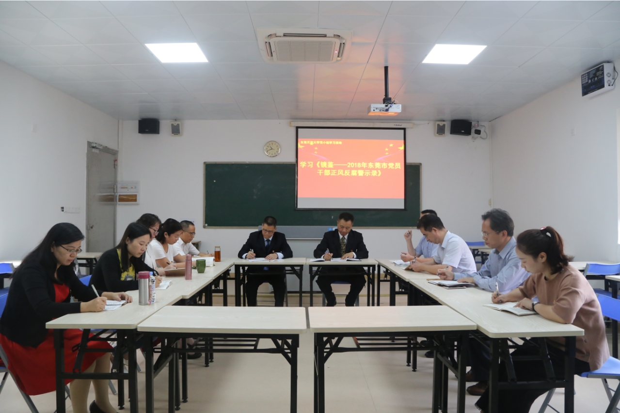 活动中,东莞开放大学3个党小组组织党员干部学习《镜鉴——2018年东莞市党员干部正风反腐警示录》,选取其中三个部分,从案例阐述、分析点评和警示提醒进行分析讲解,各位党员认真学习,从中吸取深刻教训,筑牢拒腐防变的思想道德防线。
