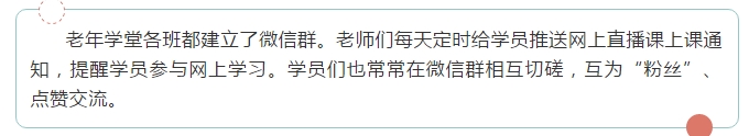 突如其来的新冠肺炎疫情虽然打乱了学校正常的开学节奏,但在这段特殊的日子里,东莞开放大学老年学堂停课不停学,积极探索现代信息技术与老年教育的深度融合,引导老年学堂学员依托互联网在线学习平台,利用微信群等方式开展形式多样的老年教育,尽可能地满足老年人的多样化需求。