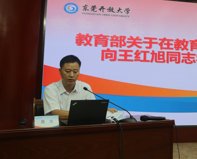 7月14日下午,东莞开放大学召开全体教职工会议,组织学习王红旭老师先进事迹。