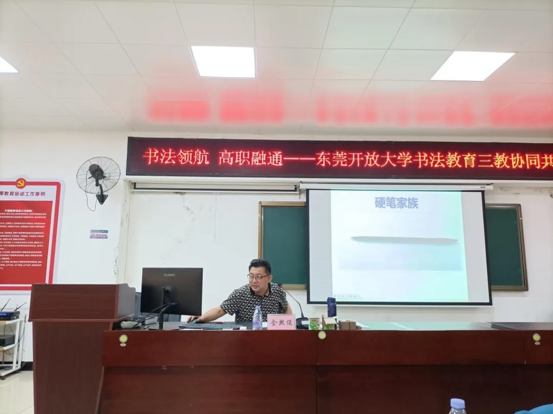 东莞市硬笔书法协会副主席、东莞开放大学书法社社长金熙俊作《硬笔书法创作谈》讲座,从书法文化、选材择题、规划布局、执笔运笔等方面就如何创作一幅硬笔书法作品进行讲解、示范。