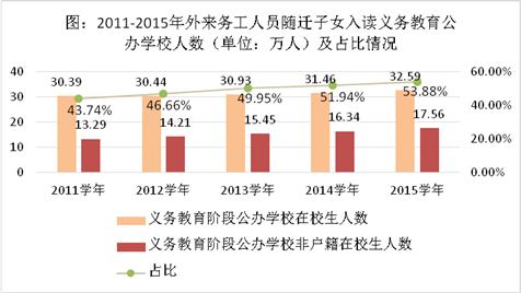 3.教育发展格局更趋开放。全市公、民办教育进一步协调发展,民办教育办学秩序得到进一步规范,办学质量进一步提高,民办义务教育阶段的标准化学校比例和优质学校比例逐年增加。“新莞人子女就学工程”实施成效显著,2011-2015年外来务工人员随迁子女入读义务教育公办学校人数年均增加10%以上;目前,全市公办义务教育学校随迁子女在校生人数占公办义务教育学校在校生总数的53.88%。建立和实施局领导分片联系机制和区域校际联盟机制,推行优质学校结对帮扶薄弱学校,推进初中学校“1+1”结对帮扶工作,实现共同提高和“抱团发展”,全市教育均衡发展水平明显提高。高中布局调整基本完成,普职比合理调控,普通高中质量稳步提升,中职教育品牌效应凸显。职业教育产教融合、校企合作进一步推进,行业、企业参与职业教育热情增高,企业课堂、企业专班、车间进校、订单培养、职教集团等培养模式成效显著。高等教育协同创新联盟工作全力推进,高层次教育国际交流合作机制初步建成,目前在莞高校与港澳台地区的8所高校和世界7个国家的8所高校建立了交流合作关系。