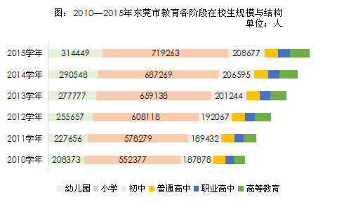 2.惠民教育体系不断完善。全市教育规模持续扩大,办学条件明显改善,优质学校占比不断提高。学前教育普惠发展,截至2015年底,全市有幼儿园949所,在园幼儿31.4万人,毛入园率从2010年的95.4%提高到99.3%,省规范化幼儿园比例达到94%,“入园难”问题基本得到解决。义务教育优质均衡发展,全市义务教育阶段学校506所,在校学生92.8万人,户籍学龄儿童入学率以及小学、初中毕业生升学率均达100%,公、民办义务教育标准化学校占比分别为100%和90%,公办义务教育校际间均衡系数为小学0.34、初中0.31,基本实现优质均衡的要求。完善特殊教育体系,全市已构建起涵盖残疾人学前教育、义务教育、中等职业教育的特殊教育体系;2015年,全市户籍“三残”儿童少年入学率达到97.1%。高中教育优质特色发展,全市有高中阶段学校65所,较2010年新建扩建了16所,新增高中阶段学位资源规模超过2万个,目前在校生15.1万人,高中毛入学率达到114.4%,公办高中优质学校比率达到100%。高等教育规模特色发展,全市高等院校9所,全日制在校生11.2万人。全市终身教育体系基本形成,共有5所成人高等教育机构、32所乡镇成人文化技术学校、568所民办培训机构,另有22个镇街(园区)创建广东省社区教育实验区。