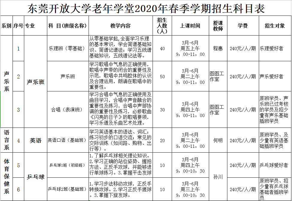“莫道桑榆晚,为霞尚满天。”老年人是社会的重大财富。东莞开放大学老年学堂秉承“打造老年教育品牌,丰富老年精神生活”的宗旨,践行“为老服务,文化养老”的理念,开设了乒乓球、瑜伽、太极拳、舞蹈、英语口语等课程。课程内容精彩丰富,受到广大老年朋友的欢迎。2018年,东莞开放大学老年学堂被中国成人教育协会评为 “终身学习品牌”项目;今年9月份,东莞开放大学加挂“广东老年大学东莞学院”的牌子,老年教育站在更高起点之上。为满足老年朋友的需求,2020年春季招生现在开始啦!本期招生,名额有限,欲报从速!具体招生班级设置内容如下: