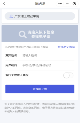 进入单位专属页面点击【自助取票】进入自助取票页,根据提示输入姓名,学号或身份证号点击【查找电子票】进行取票。取票成功后提示归集成功,归集成功页如图所示。学生可在归集成功页点击【前往票夹查看】查看归集到的票据信息。