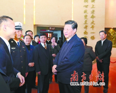 17日上午,习近平一到兰考,就直接前往焦裕禄同志纪念馆。一幅幅图片、一件件实物、一个个故事,生动展现了焦裕禄的音容笑貌和感人事迹,习近平边看边问,不时驻足。他同焦裕禄亲属和基层模范干部代表亲切交流并合影留念,动情地说,我们这一代人是深受焦裕禄同志事迹教育成长起来的,焦裕禄同志的形象一直在我心中。5年前我到兰考参观了焦裕禄同志事迹展,今天来再次深受感动,引起心灵的共鸣。焦裕禄同志是县委书记的榜样,也是全党的榜样,他虽然离开我们50年了,但他的事迹永远为人们传颂,他的精神同井冈山精神、延安精神、雷锋精神等革命传统和伟大精神一样,过去是、现在是、将来仍然是我们党的宝贵精神财富,我们要永远向他学习。前来参观学习的干部群众纷纷向总书记问好。习近平走上前去同他们握手,祝他们学有所获。